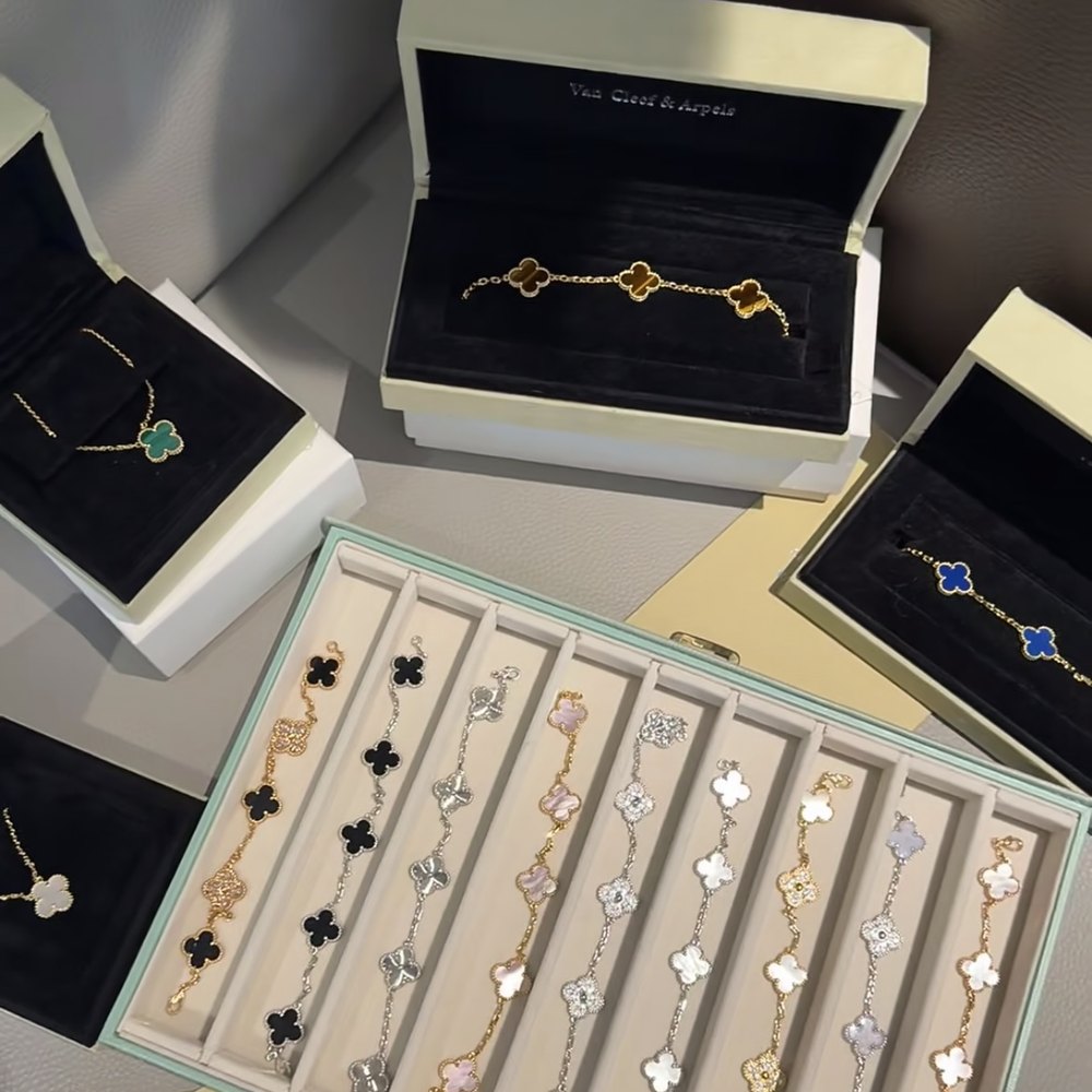 Available in Gold, Silver, and Rose Gold finishes with multiple clover color options including Black, White, Red, Blue, Green, Pink, and Purple.